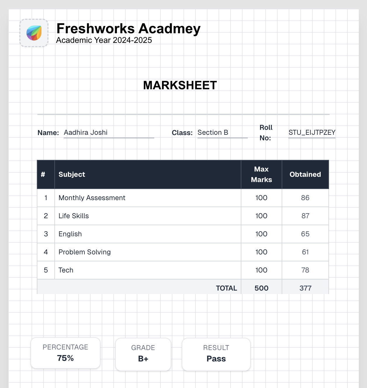 No more manual copy-pasting. Define 'Keys' for every data point (Attendance, Subject Marks, Remarks) and map them dynamically to your layout.